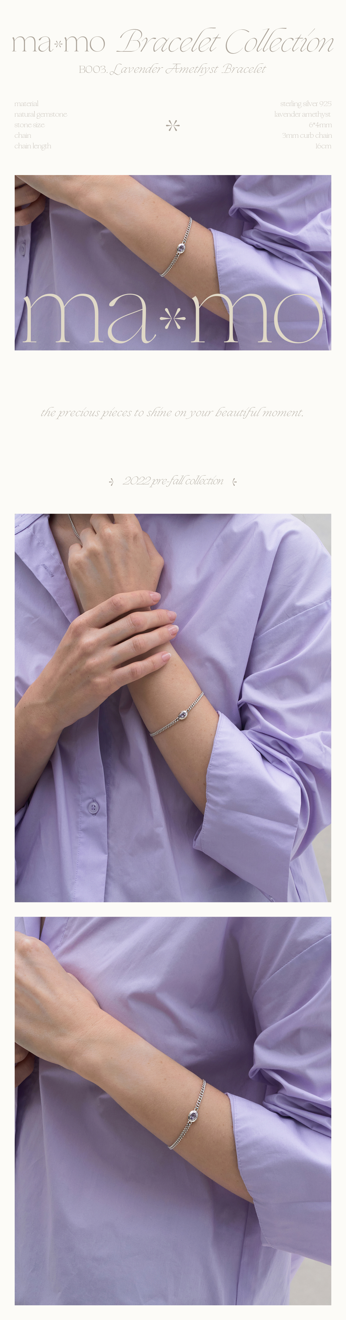 2월의 탄생석인 자수정은 귀족을 상징하는 돌로 귀하게 여겨졌으며 행복감을 상승시켜주는 원석으로 알려져 있습니다. 진한 보랏빛의 자수정은 본연의 컬러가 진해 맑고 투명한 광택을 찾기 어려우나 라벤더 자수정(lavender amethyst)에서는 스톤 안쪽에서부터 뿜어져 나오는 광채를 볼 수 있습니다. 화려하면서 은은한 연보랏빛의 투명함이 멋스러운 원석입니다.